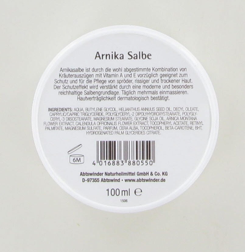 Arnika Salbe, die besondere Pflege für Hände, Gesicht und Füße. Arnikasalbe ist durch die wohl abgestimmte Kombination von Kräuterauszügen mit Vitamin A und E vorzüglich geeignet zum Schutz und für die Pflege von spröder, rissiger und trockener Haut. Der Schutzeffekt wird verstärkt durch eine moderne und besonders reichhaltige Salbengrundlage. Täglich mehrmals einmassieren. Hautverträglichkeit dermatologisch bestätigt.