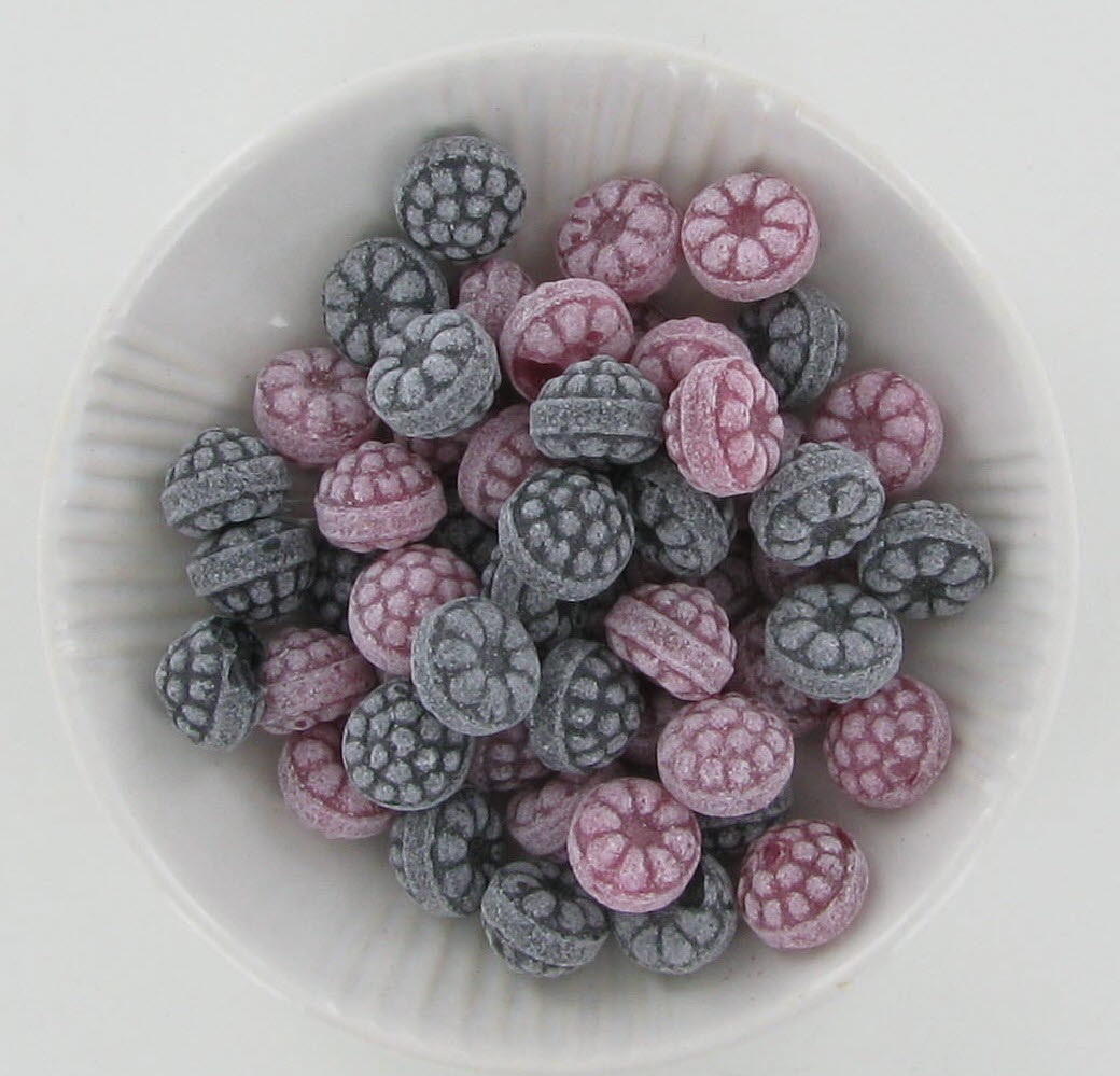 rote und schwarze ungefüllte Bobons in Beeren-Form, leicht weißlich kandiert