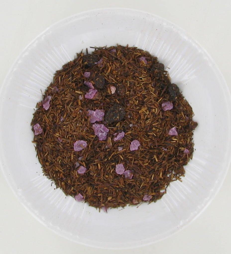 Rotbuschtee, Aromen, lila und grüne Zuckerflocken, Korinthen, Himbeerstückchen